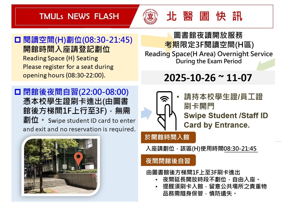 - The entrance to the 3F for night self-study will be accessible by swiping the card from 22:00 to 08:00.
